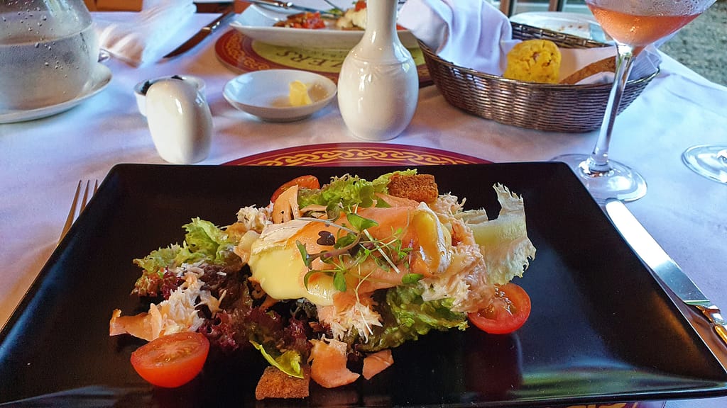 First course of brie wrapped with cured salmon over a fresh crab salad