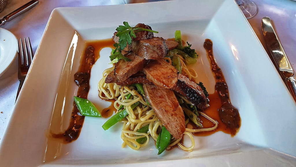 Slices of duck served on noodles and snow peas with a berry sauce